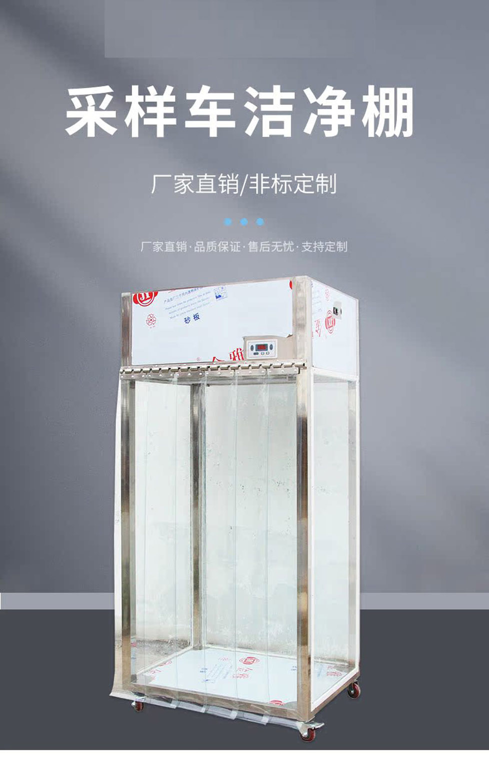 该产品适用于医药制剂(无菌制剂除外)原材料的采样。根据GMP标准要求,本公司 生产的采样车达到万级洁净度,同时使用的电动原件符合GB1497-85(电动安全标准); 符合GB-191(包装标准)的规定。 使用方法: ●洁净采样车移到需要采样的地方,固定采样车(刹车);接通电源,打开电源开关,打 开风机开关; ●风机开始工作,将电压调至适当(一般220V)中,待洁净采样运转15分钟后,放入采样 桶; ●采样结束后,取走采样桶,关掉风机及电源,拔掉电源线,将采样车移到原来的位 置。