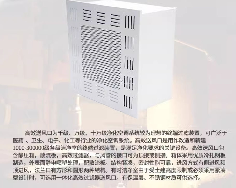 高效送风口的外壳用优质冷轧钢板制作,表面静电喷塑,含静压箱,高效过滤器,散流板,在改建和新建各级洁净室,可作为终端高效过滤装置在洁净顶棚等处,具有投资少,施工简便等优点。