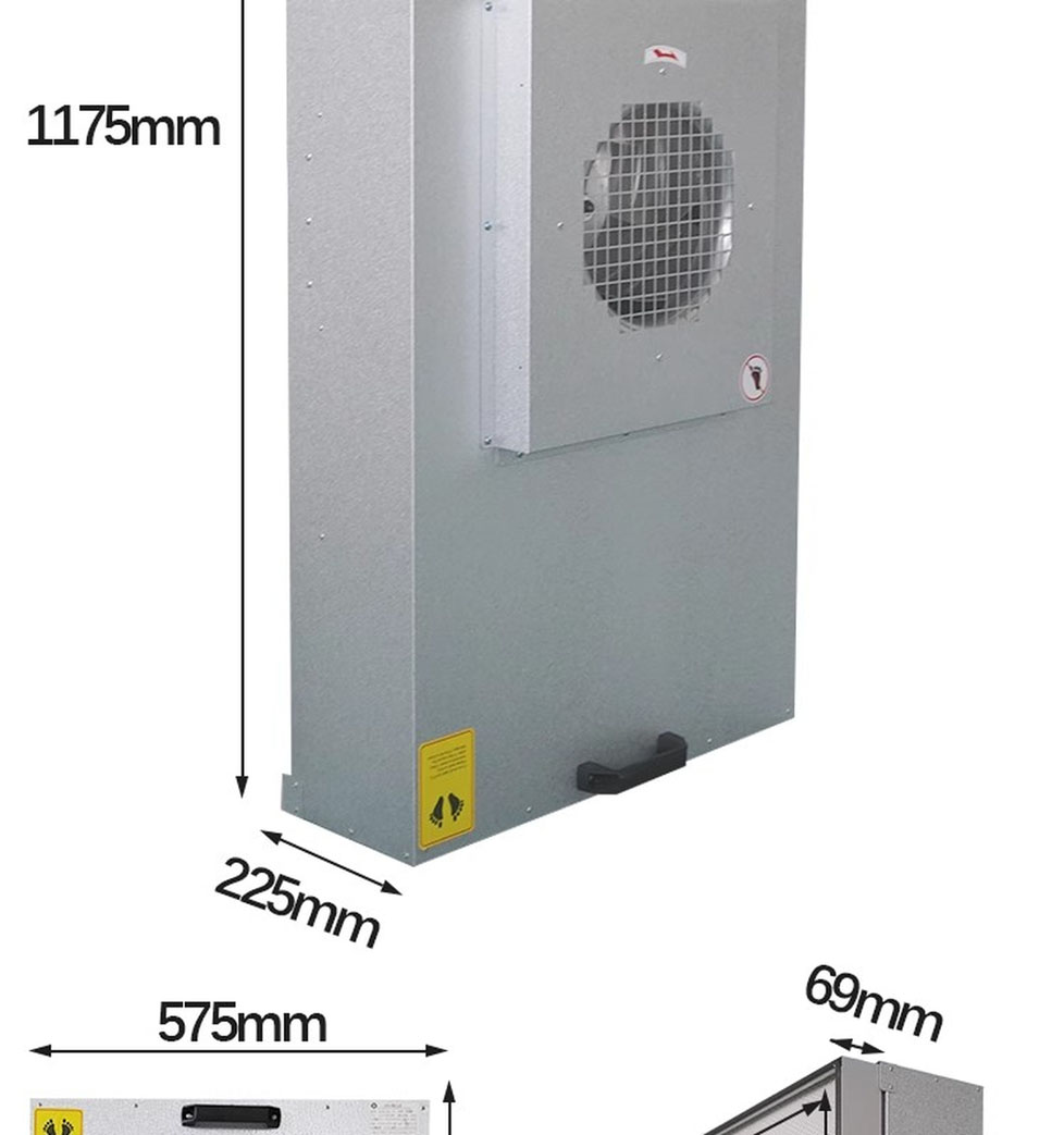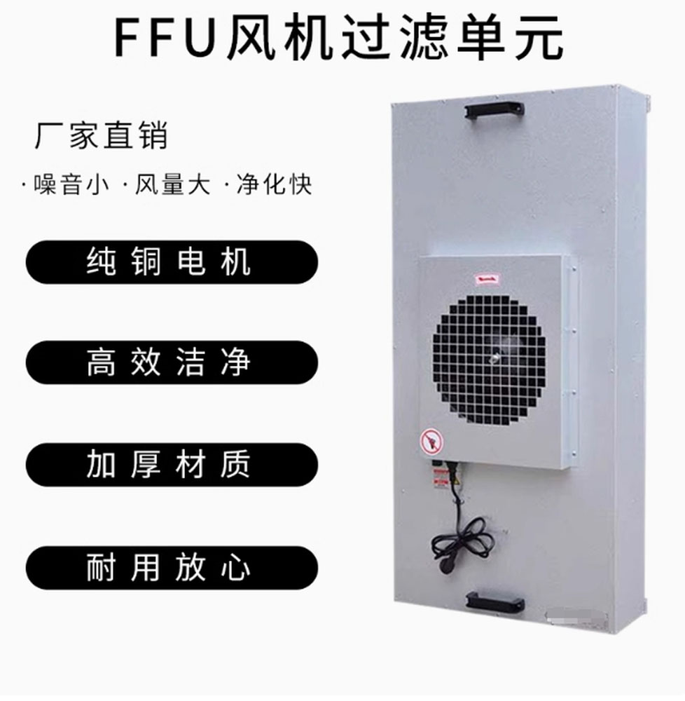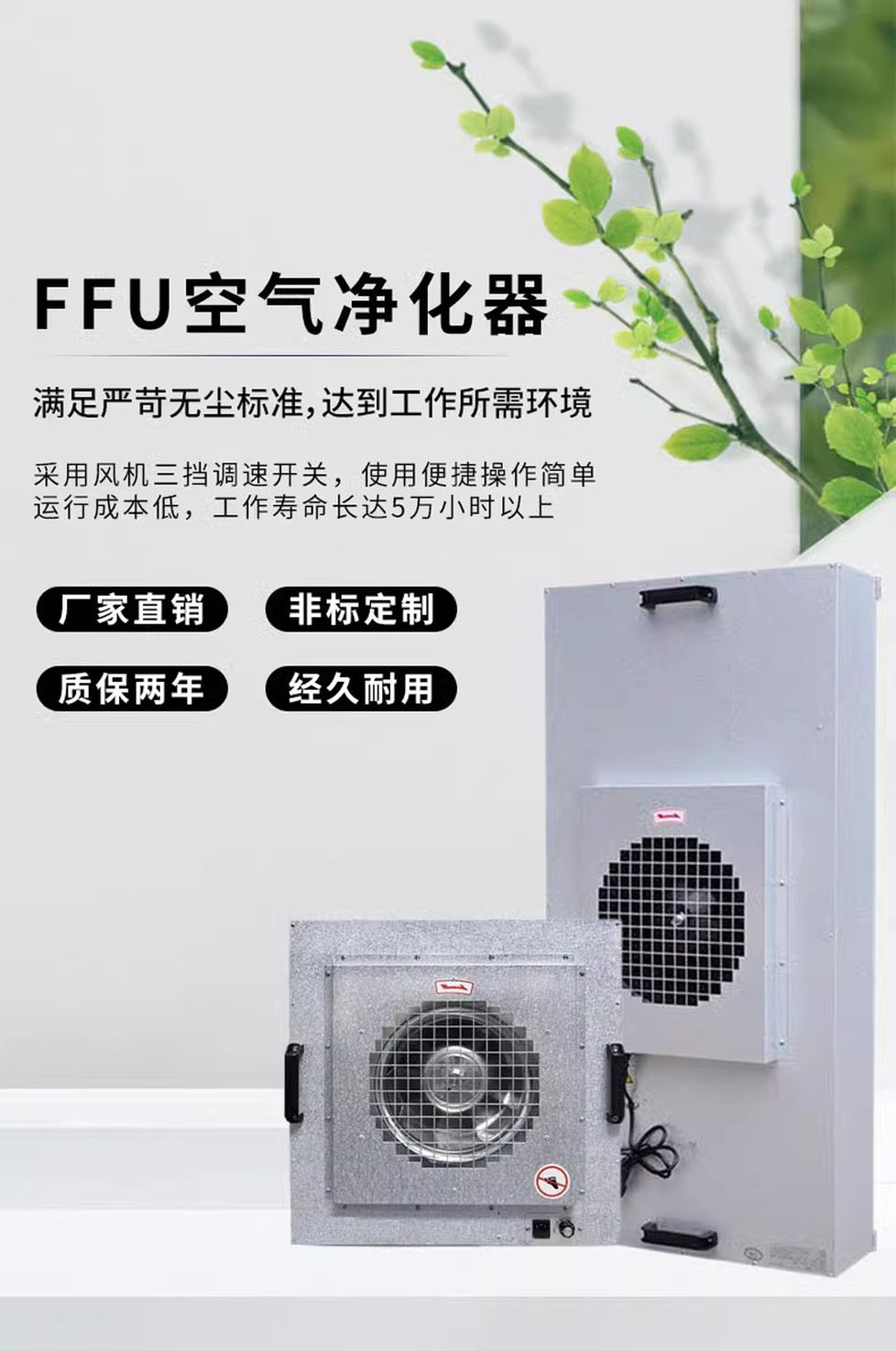FFU风机过滤器机组可模块化连接使用,使得FFU广泛应用于洁净室、洁净工作台、洁净生产线、组装式洁净室和局部百级等应用场合。FFU有初、高效两种过滤网。分机从FFU顶部将空气吸入并经初高效过滤器过滤,过滤后的洁净空气在整个出风面以0.45m/s±20%的风速均速送出。