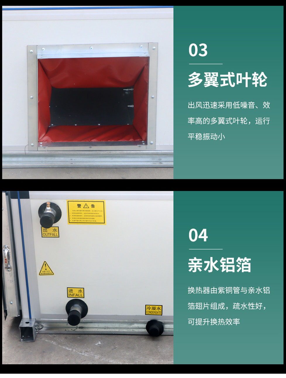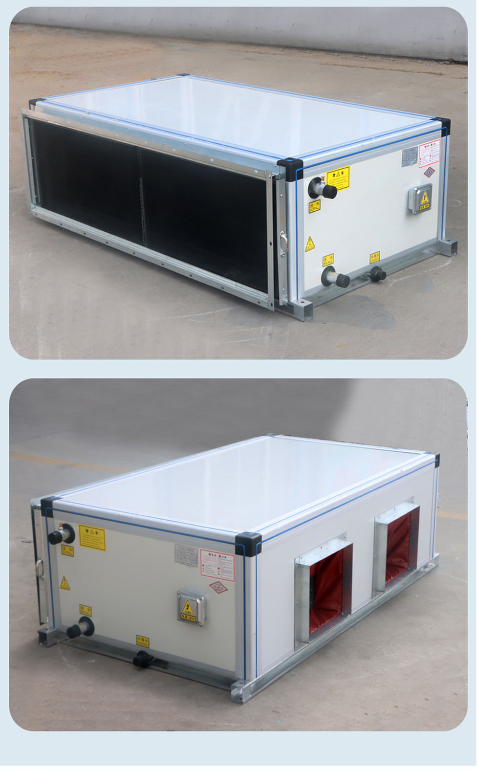 ●机组设有新回风混合段与过滤段、新回风混合段、初效过滤段、均流段、消声段、风机送风段等功能段,可供设计院及用户灵活选用组合。