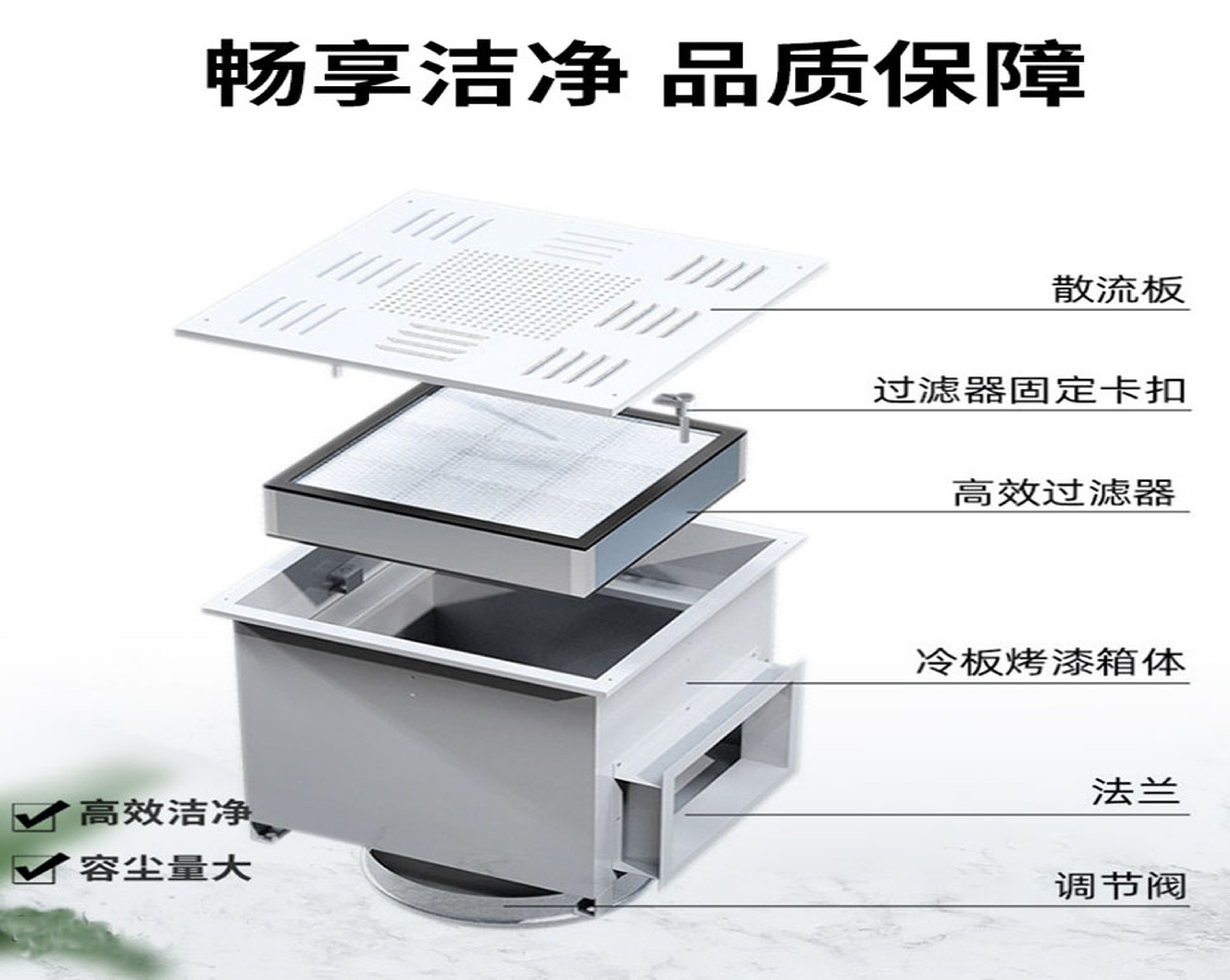 2. 箱体结构与材质:箱体主体由冷轧钢板焊接而成,所有焊缝均采用专用胶密封处理,有效防止空气泄漏。散流板通过固定螺栓连接,安装与拆卸极为便捷。更换过滤器时,工作人员可直接在天花板底部操作,无需拆卸整个箱体,大大简化了维护流程。